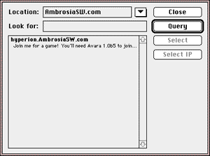 The Avara Tracker is a program written by Matt Slot that runs on our SGI server. It's sole purpose is to keep track of current Avara games. To find out what games are currently in progress or waiting for opponents, Avara has a Query dialog box built right into the program that lets you do just this.