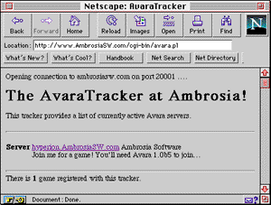Chris Russo has also built a WWW interface to the Avara Tracker, so you can also check out what Avara games are active by using your favorite Web browser.