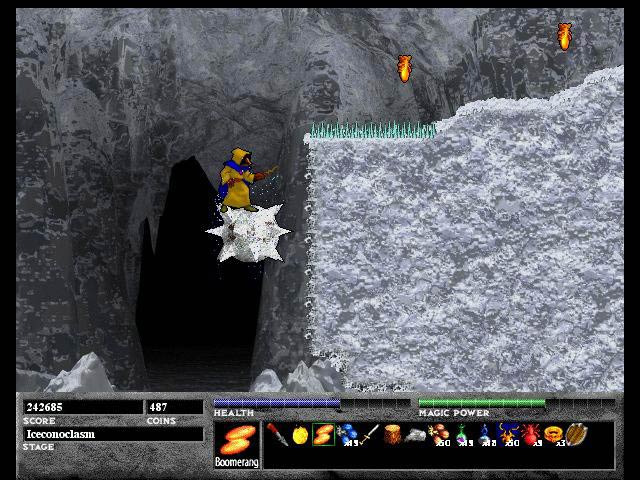 Get the power up and go back to Picture 7 and hop on the spiked ball as I am doing in Picture 9. Once you make to the ledge go right and hop on the floating platform and then on the right wall to get another Invincibility power up as in Picture 10. Head on down and you will see low-hanging walls with spikes on either side. This is where the Invincibility power up will be helpful because it protects you against the spikes. To get past the walls, just run towards them and duck to slide underneath. Once you're past them go down to another small cavern, kill all of the Trolls, and head to the right. In Picture 12 you will find the Ice Wall spell. This spell has two important functions in the rest of this level and I'll explain them shortly. For now go back to the floating platform that took you to the first Invincibility power up.