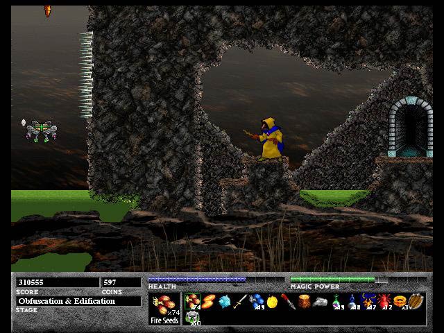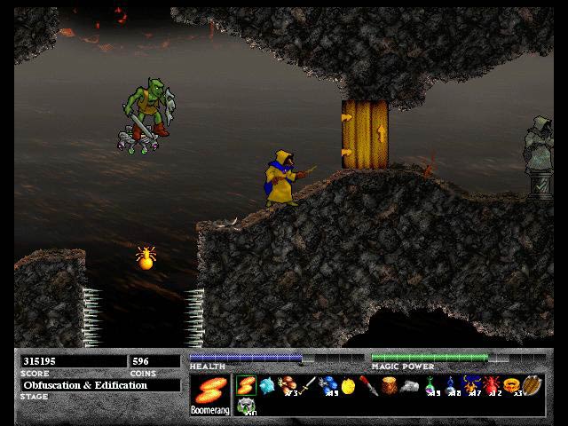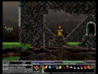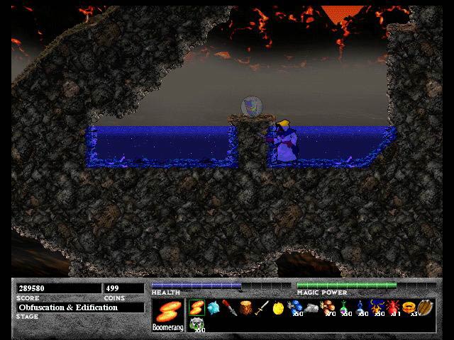 Exit the room in Picture 30 and use the Ice Wall spell to climb to the top to get to Picture 31. The chest has a Gold key that is needed for another door to get to the exit. Now go back to Picture 27 and go left past the water to Picture 32. Climb up and kill the Sword-wielding Goblin and break the wall as I am in Picture 33 to get a High Jump power up that I find to be useless in this level. Go back down and you'll be in Picture 34 which just happens to be to the right of Picture 17 and left of a door that needs the Gold key that you picked up earlier. Go through and there is a handy save point.