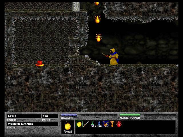 Take a ride on the cart which hops over a small acid pool. Kill the green slime and head left. There are a bunch of bats in this area so kill them all and keep going left to see a shallow pool of water. Walk to the right and swim down to get to Picture 21. Break the wall to Ferazel's right to get some Gold Xichrons. Go to the bottom of the lake and Spin Jump to get more Gold Xichrons as I'm doing in Picture 22. Head to the surface, walk left, and then up to see the prize of this entire level. In Picture 23 you see a scroll on top of a pedestal. This scroll teaches you the Statue Spell that freezes enemies in their tracks. Save if you want and then go up and left to find the exit. Whew! The Western Reaches was a looping cave but you earned a lot of coins and points and became a better player of Ferazel's Wand. You also learned your second spell which will come in handy when you go further into the caverns to rescue your fellow Habnabbits. If you follow this guide, you will get 100% score just as I did. Next stop, Eastern Reaches. |